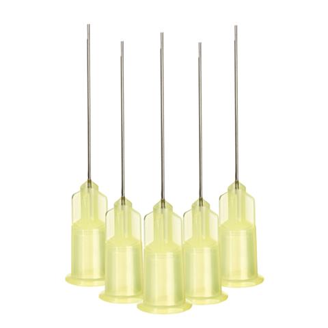 Agulha fina, metálica e arredondada (27 ga, Ø 0,40 mm) com extremidade anti-obturação única. A ponta apresenta ventilação de um dos lados para irrigação lateral, evitando o perigo da extrusão de fluidos através do ápice. Comprimento da agulha 25 mm.
