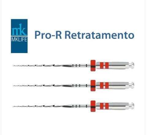 Limas Pro-R Reciprocante Retratamento 25mm, taper variável, possui secção transversal em hélice dupla. Também indicada para desobturação de canais, em retratamento.